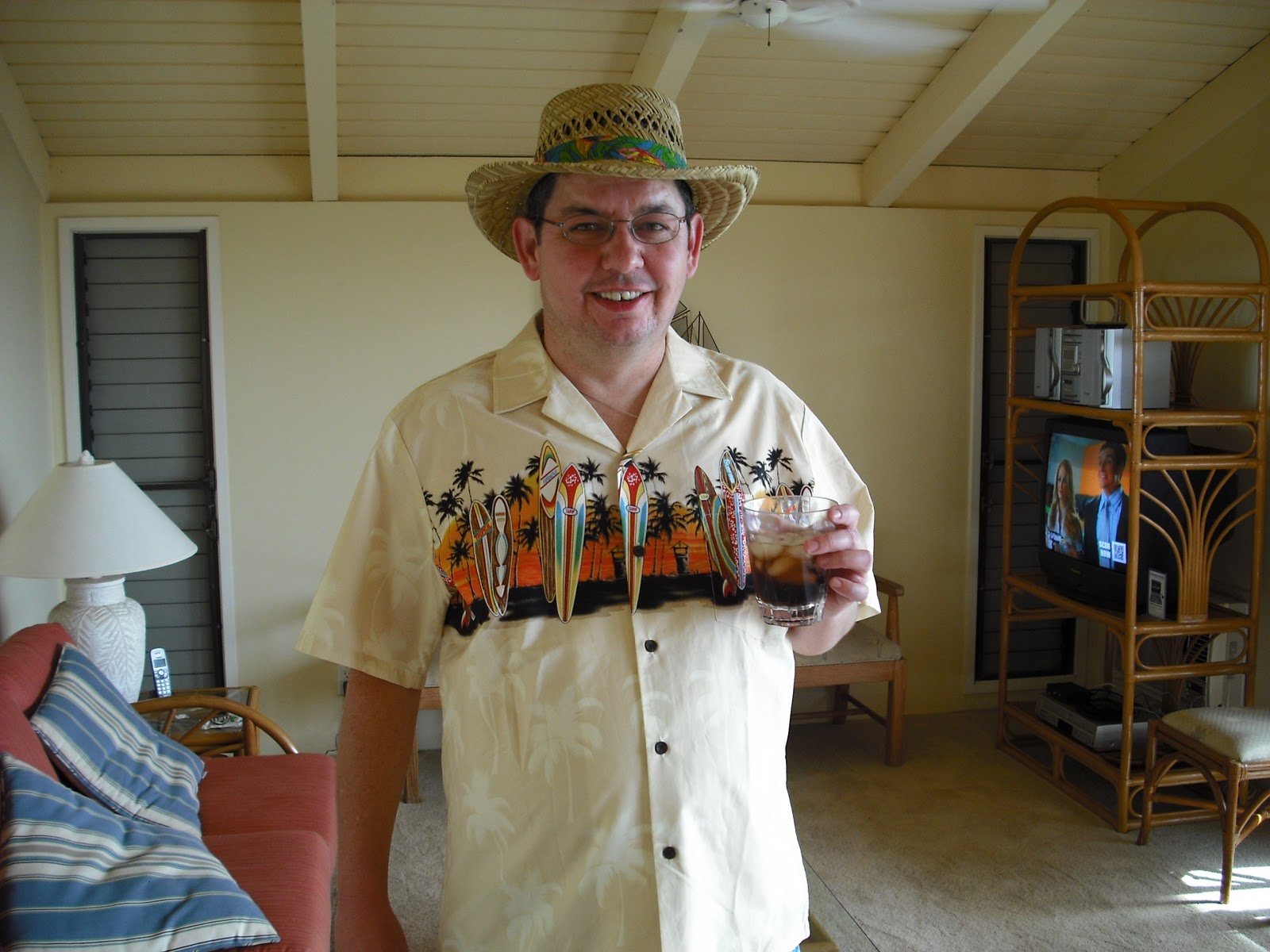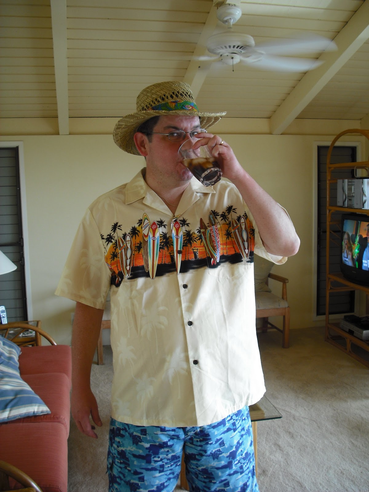 We stopped at Whalers General Store in the Shops at Wailea and at Hilo Hattie’s in Kihei for some souvenir shopping. Steve is loving the Hawaiian shirts and, as evidencedin these pictures, is quickly morphing into a tacky tourist, with his gaudy shirts and his straw hat with a bright gaudy thing around the brim. But he’s loving it!!!