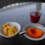 Up early again – before 6. Breakfast of fresh pineapple and papaya, with a coconut pastry from T. Komodo Bakery in Makewao, and coffee. Delicious! The morning was a bit cooler – 22C when we were sitting out having breakfast. It sounds like it may be a tiny bit cooler today – a high of 77F. We were going to go to the beach by 7, but as it’s a bit cool, we decided to wait for a couple of hours.