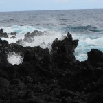 We made a quick stop at “Aunty Sandy’s Banana Bread” stand and bought a couple of loaves.  Pretty expensive at $5.50 for a very small loaf – but it was delicious!  We then went a little bit further down that same road and took scads of photos of the waves crashing up against the lava rocks.  The sound and sight of the waves was phenomenal.