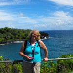 Our next stop was the beautiful Oheo Gulch (7 pools).  We had an hour to spend.  The loop down to the pools and back is a half mile.  We went down – weren’t going to go all the way because my back and hip were aching, but just could not stop.  It was that beautiful.  We had to go all the way down.  Large rock formations with pools in them, and at the end, huge white waves crashing against the rocks.    Hiked back up to the top to wait for Barry, and piled back into the van