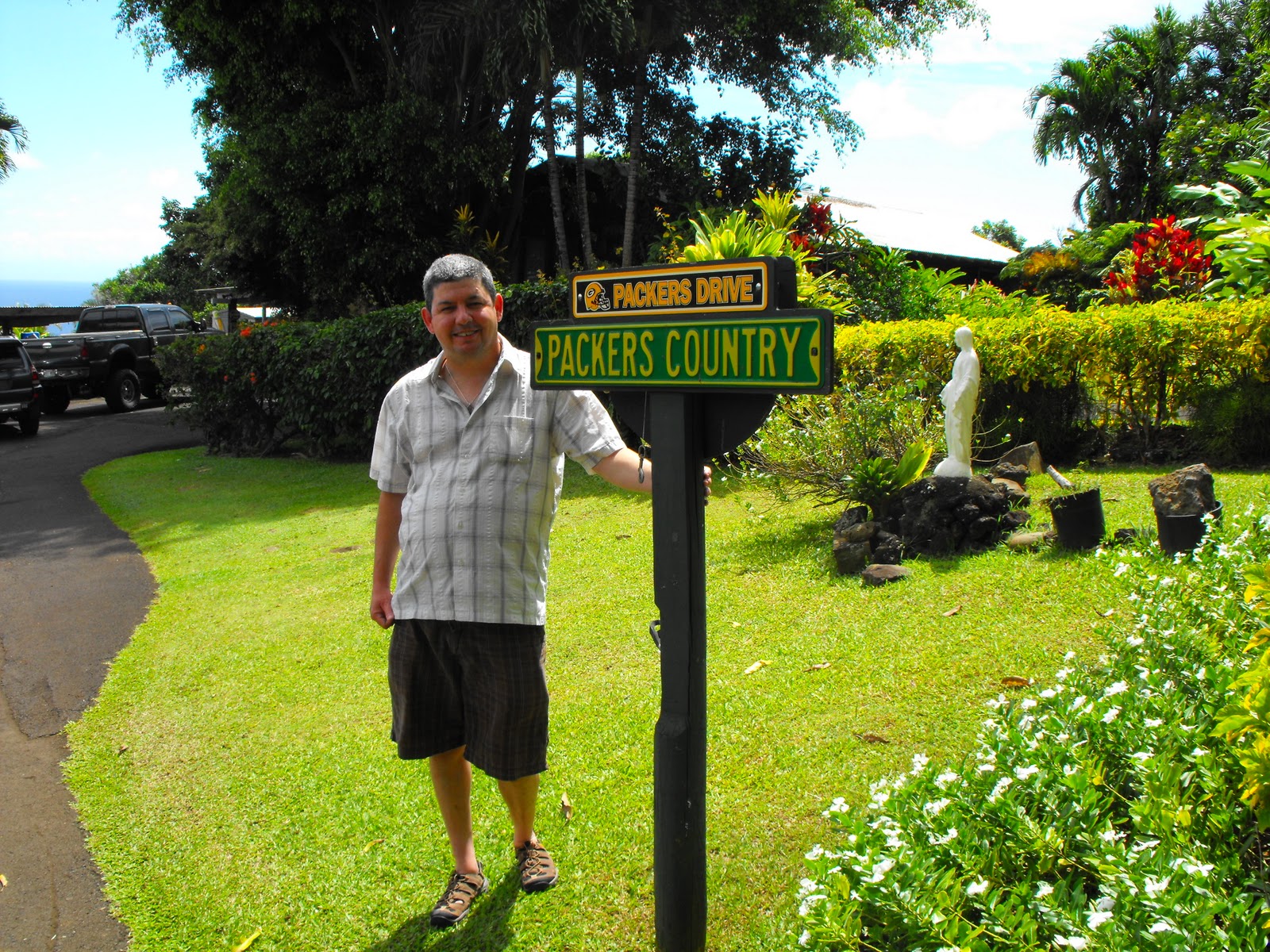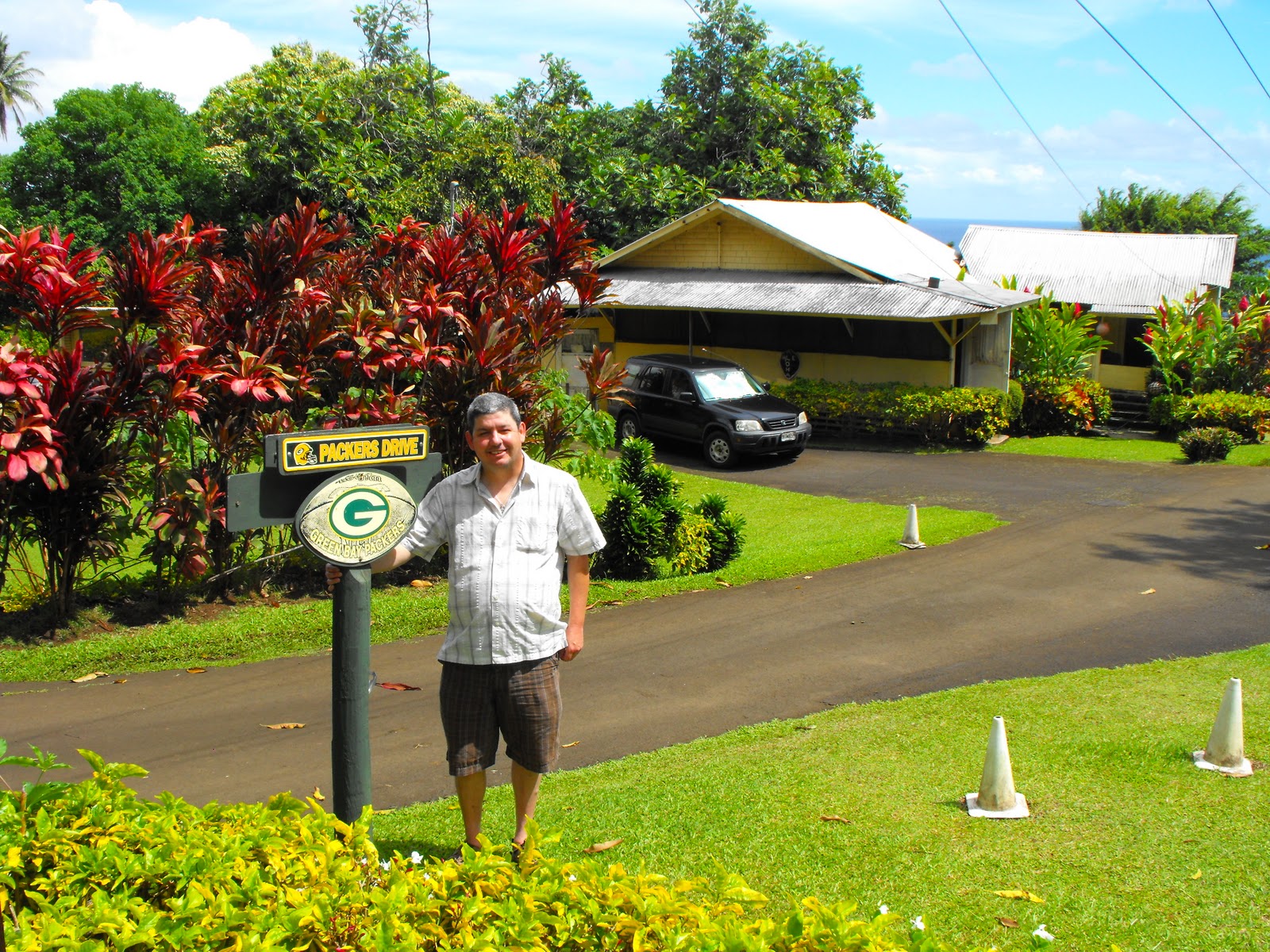 So we’ve left Hana and the Flower Farm when Barry asks “Any Packers fans here”.  Steve, the ultimate Packers fan shouts out “Yes, me!”.  Barry pulls over.  There is an old lady there (Beverley Pu) who is a HUGE Packers fan.  In fact she plants specific plants of green and gold in her yard.   Her street is unofficially called Packers Drive….here it is….